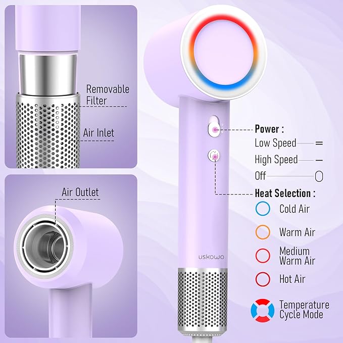 - 【1800 Watt High Speed Brushless Motor】USKOWO hair dryer is equipped with a 160, 000 rpm high-speed brushless motor.which can instantly generate strong airflow to quickly dry hair. Faster drying means time-saving and less damage to your hair.