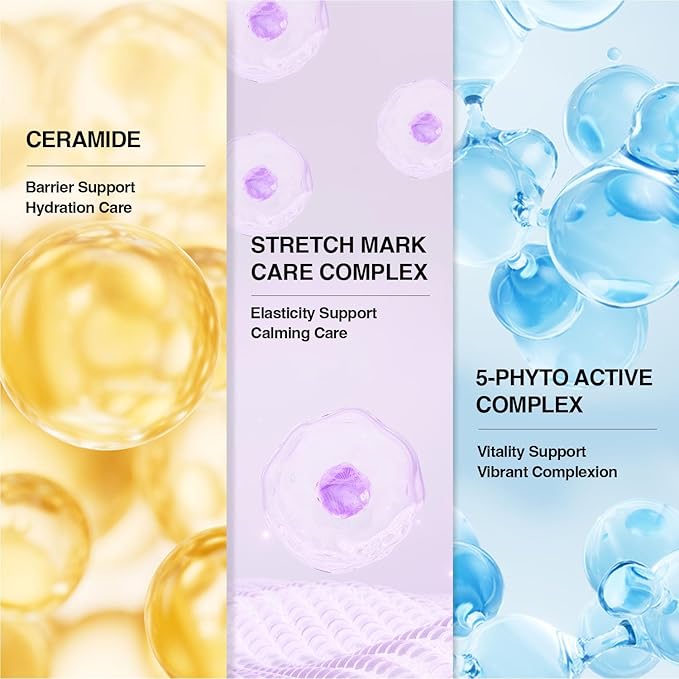 - PATENTED COMPLEXES – STRETCH MARK CARE COMPLEX and 5-PHYTO ACTIVE COMPLEX help provide moisture and support overall skin condition