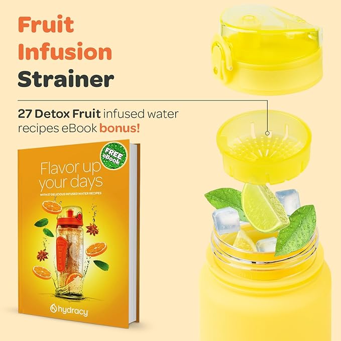 - ๐ SMART DESIGN Equipped with a detachable travel carry strap, spill proof flip top lid, convenient wide mouth and a Fruit Infusion strainer, your stylish Hydracy water bottle has everything you wanted and more! It also comes with a 27 Detox Fruit infused water recipes eBook bonus!