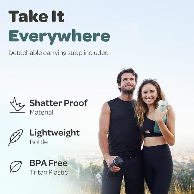- ๐ฑSAFE, NON-TOXIC, DURABLE This shatterproof, light and reusable water bottle is made of 100% BPA Free Tritan plastic. You can relax and enjoy your water clear of harmful chemicals, plastic taste or bad smell!