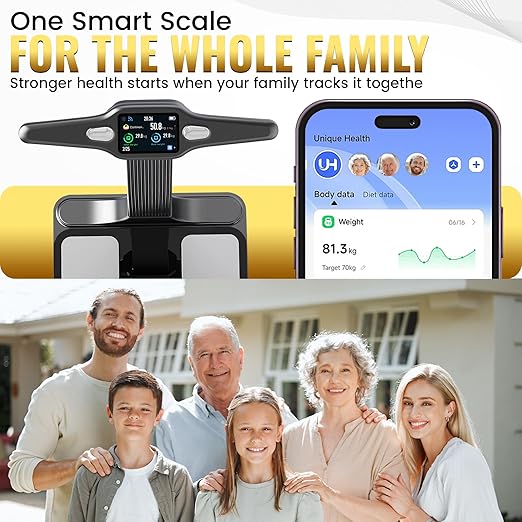 - SEAMLESS APP SYNC: Connect your smart scale with app support via WiFi or Bluetooth to sync data in real-time. Compatible with your favorite health Apps such as Apple Health, the Unique Health app stores 90 days of body composition data for up to 50 users, making this the ideal body fat scale with app for families, personal trainers, and fitness journeys.
