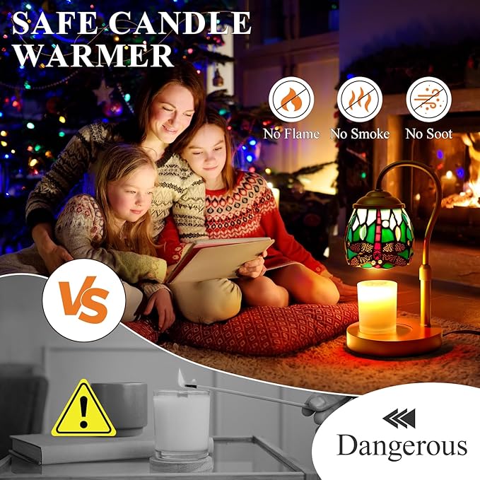 - Eco-Friendly & Flameless Safety: Our tiffany style candle warmer lamp uses a gentle 50-watt bulb (One bulb lasts for 1500 hours) to melt wax evenly—no open flame, smoke, or soot. Candle warmer lamp releases the full fragrance of scented candles. This stained glass candle lamp warmer Ideal for eco-conscious homes with children or pets, this candle warmer offers a safer, cleaner, and more efficient alternative to traditional candle burning
