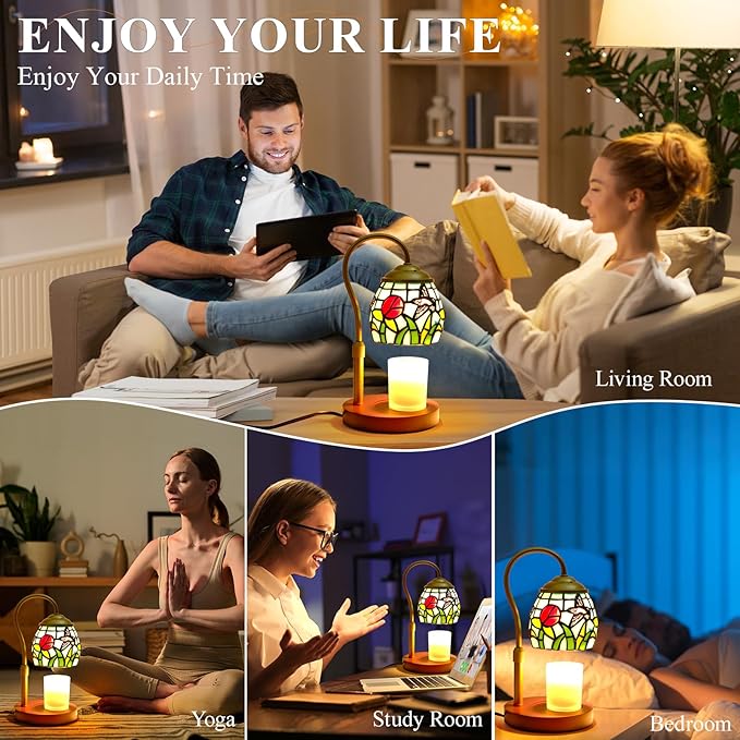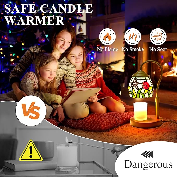 - Eco-Friendly & Flameless Safety: Our tiffany style candle warmer lamp uses a gentle 50-watt bulb (One bulb lasts for 1500 hours) to melt wax evenly—no open flame, smoke, or soot. Candle warmer lamp releases the full fragrance of scented candles. This stained glass candle lamp warmer Ideal for eco-conscious homes with children or pets, this candle warmer offers a safer, cleaner, and more efficient alternative to traditional candle burning