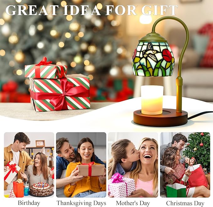 - Ideal Gift Choice: The electric candle warmer with tiffany style stained glass elegant design and soft glow, is suitable for use the study room, living room, bedroom, yoga room or office. This vintage candle warmer lamp ideal gifts choice for family, friends and loved ones on birthdays, Mother's Day, Valentine's Day, Thanksgiving, housewarming or Christmas