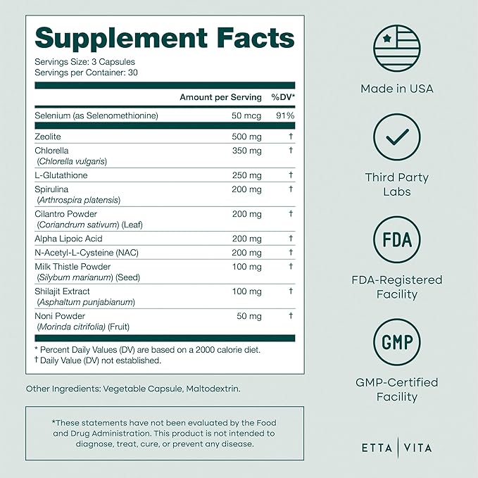 - [Full-Body Detox Support] - Targets multiple detox pathways including liver, kidney, and cellular systems. Etta Vita zeolite capsules offer an ideal heavy metal detox for adults looking to refresh their internal health and restore balance.