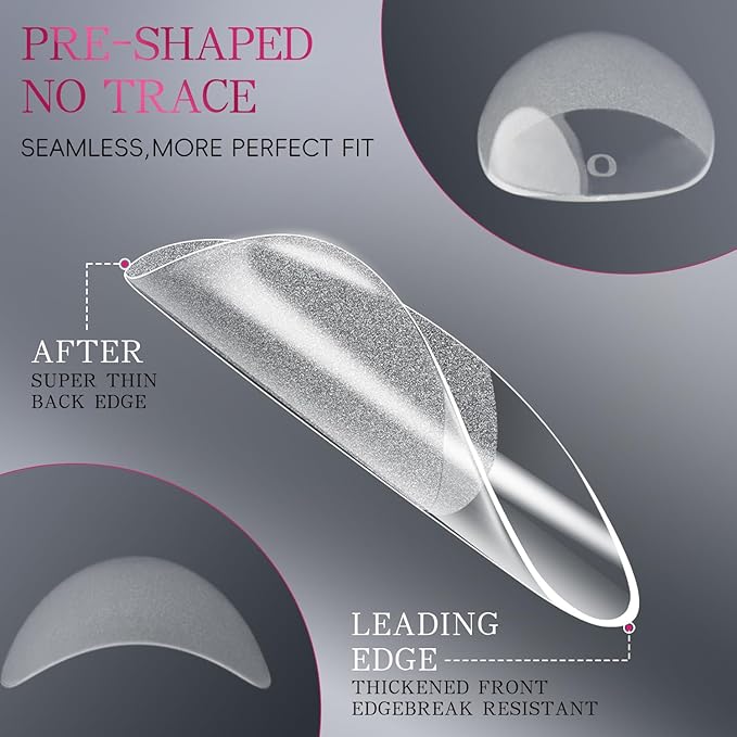 - 【12 Sizes Almond Tips for Perfect Fit】Features 240 pieces of clear almond nail tips in 12 versatile sizes, ensuring a custom fit for every nail. Made from soft, flexible gel material, these pre-shaped almond press on nails seamlessly blend with your natural nail curve for a comfortable, salon-quality manicure at home