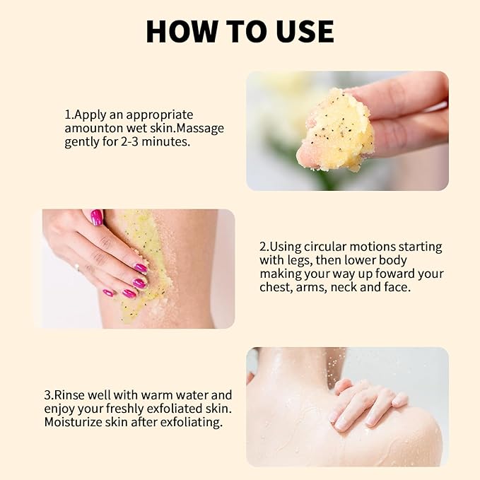 - 【How to use】Apply to wet skin and gently massage in a circular motion, focusing on rough areas. Rinse thoroughly and pat dry.For best results, use this product regularly. For external use only. Do not use on open wounds. Keep out of children’s reach