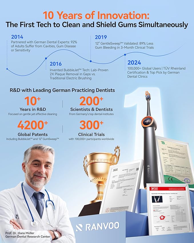 - [Flushing & Brushing 2-in-1, Certified 100% Plaque Removal]:Different from traditional sonic or rotary toothbrushes, RANVOO has obtained the BubbleJet patent, using an exclusive sonic vibration & bubble jet dual-effect system, borrowing the Coanda effect, and injecting 110,000 dense bubbles into the water flow for the first time, 100% removing plaque and residues between teeth, achieving flushing and brushing in one, and obtaining the first-level cleaning power certified by the National Oral Research Center, opening a new era of bubble tooth cleaning.