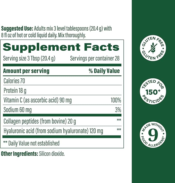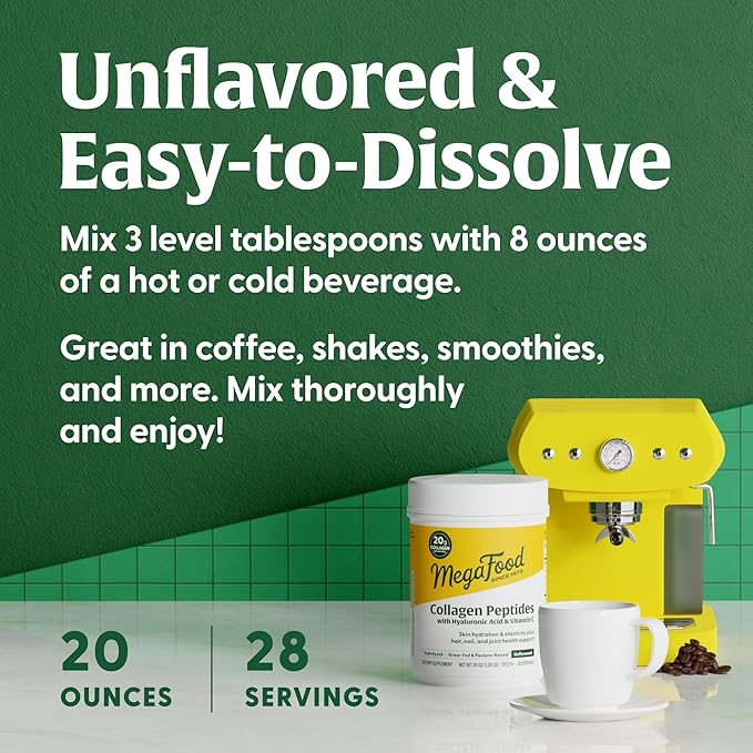MegaFood Collagen Peptides for Women & Men - Unflavored Collagen Powder with Hyaluronic Acid & Vitamin C - Supports Skin Hair Nails & Joint Health - 20g Grass Fed Bovine Collagen - 20oz, 28 Servings