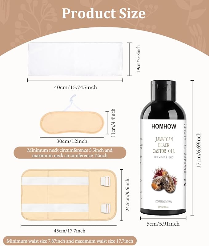 - Organic castor oil pack wrap Kit: Castor oil pack contains 1 castor oil wrap for neck, 1 castor oil pack wrap for stomach, 1 organic flannel fabric caster oil patch and a bottle of natural organic jamaican black castor oil.