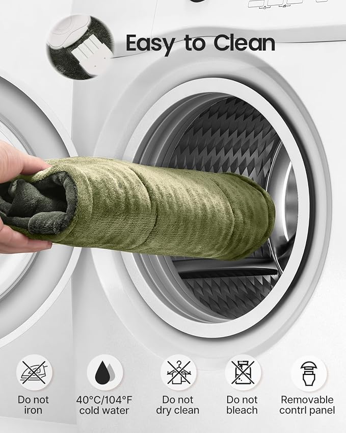 - Easy to Clean: It's made from super soft 100% polyester which has fine and dense plush, it's soft to the touch and provides maximum comfortis. Heat pad is machine washable after removing the controller. You can also spot clean using a damp washcloth with mild detergent. NOTE: The hand control cannot be immersed in water, so pull it out before cleaning. Since it has built-in heating wires, please do not machine wash it frequently. Do not tumble dry or iron at high temperature.