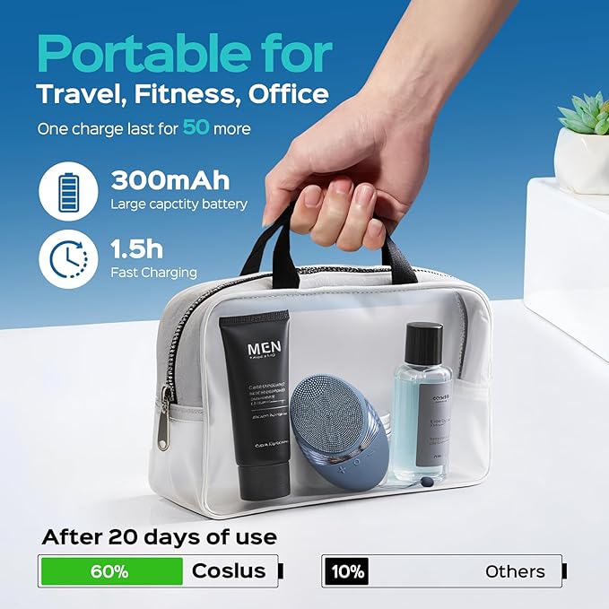 - Waterproof and Travel-Ready for Active Lifestyles: Built with an IPX7 waterproof rating, the COSLUS face scrubber is safe to use in the shower or at the sink. Its compact and cordless design fits easily in your gym bag or carry-on, making it the ideal companion for frequent travelers, business professionals, or backpackers on the go. Whether you're prepping your skin before a meeting or refreshing it after a long flight, this portable Face Scrubber supports consistent deep cleansing and massage benefits, helping your skin stay refreshed anywhere—even on the road