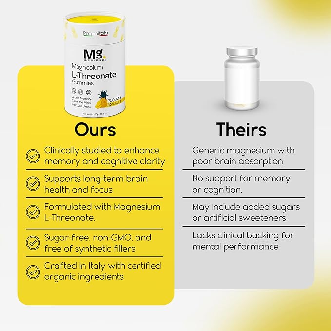 Magnesium L-Threonate Gummies for Adults & Kids 2000mg – Brain Supplements for Memory and Focus - Calm Magnesium Gummies for Improved Sleep and Healthy Mind - Pineapple Flavor 60 Count