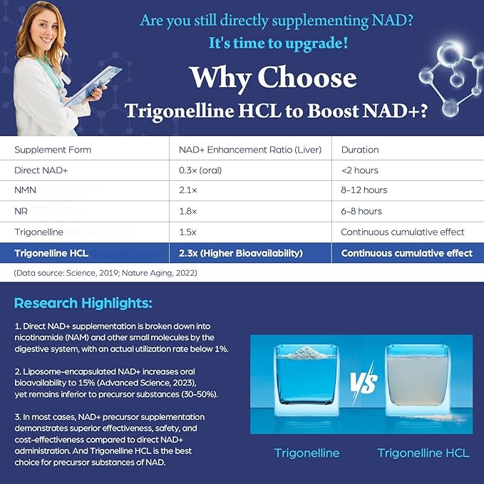 - Faster Absorption and Utilization - Pure plant extract Trigonelline offers better safety, superior bioavailability and efficiency in supporting NAD+ levels. Trigonelline may increase NAD+ levels by up to 10x and may sustain these levels for up to 24 hours, far longer than other NAD precursors, like NMNH, NR, NADH, pure NAD and so on. Moreover, Trigonelline HCl has a more stable form and higher bioavailability compared to Trigonelline.