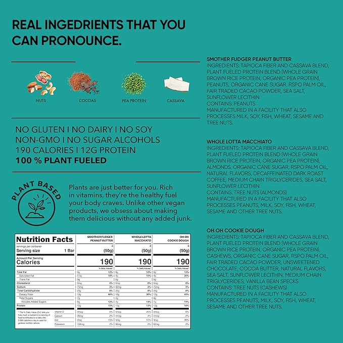 - ENJOY GUILT-FREE INDULGENCE: Snack your way through nutty, coffee-infused, and cookie-inspired flavors with only pronounceable ingredients like Almonds, Cassava, and Pea Protein. These bars are free of gluten, dairy, soy, and sugar alcohols and pack a powerful 12g of lean, plant protein and 11g of fiber. A light, 190-calorie snack that keeps you energized and satisfied anytime!