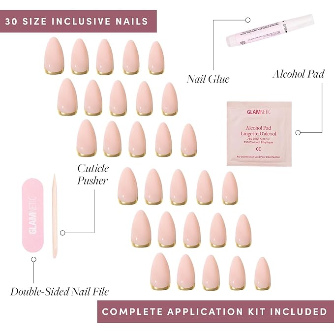 Glamnetic Press On Nails - Goal Getter | Medium Almond Fake Nails and Neutral Gold Reverse French Tip, Salon Quality | 15 Sizes - 30 Nail Kit Wtih Glue