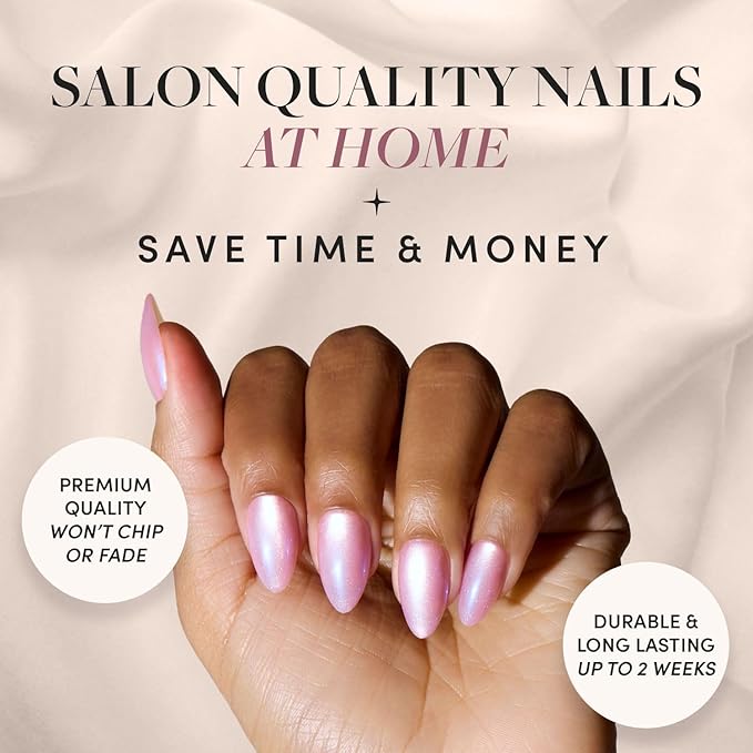 - Channel your inner siren with the Seaspell Press-On Nail Set. Drenched in a dreamy pink shade and a shimmering velvet finish, these short almond nails capture the elegance of underwater mermaids. Perfect for summer nights and tropical vacations, you’ll have anyone under your spell for up to 2 weeks.
