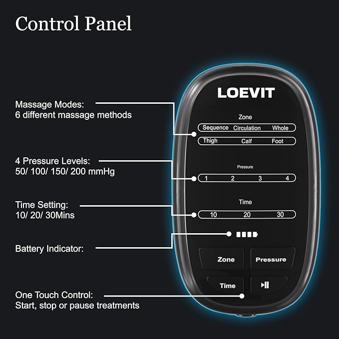 - Customizable Compression Control for Personalized Comfort: The leg compression massager offers 6 distinct compression modes, 4 adjustable intensity levels (80, 110, 140, and 160 mmHg), and 3 timer settings (10, 20, and 30 minutes), providing you with full control to customize each session according to individual preferences.