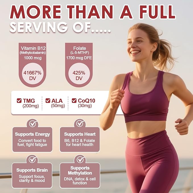 - METHYLFOLATE + TMG FOR METHYLATION SUPPORT: Includes 1700 mcg DFE of L-5-MTHF (the most bioactive folate) and 200 mg Trimethylglycine (TMG), a natural methyl donor. This duo promotes healthy homocysteine metabolism, supports methylation pathways, and helps improve cognitive clarity and emotional balance—especially for those with MTHFR gene variants.