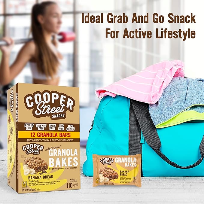 Cooper Street Banana Bread Granola Bakes (12 pack) - Individually Wrapped Soft and Chewy Breakfast Granola Bars - Nut, Dairy & Soy Free - Great As Kids Snacks For School, Hiking Or Work