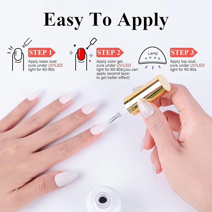 - 【Tips】: Top and Base Coat required(No included), soak off U V gel nail polish need to be cured under nail lamp dryer, average for LED 60s / UV 2 mins.
