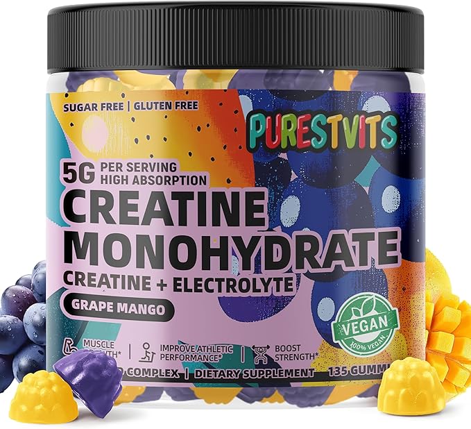 - [Vegan, Gelatin Free, Sugar free]: Each bottle contains 135 count vegan, non-GMO & gluten-free, sugar free creatine monohydrate gummies. Super delicious.