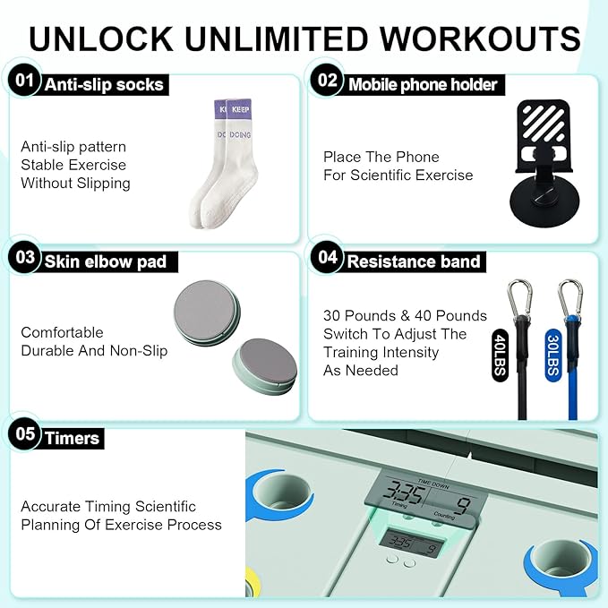 - ๐งโโ๏ธ Built for Safety & Stability: Features 330 lb weight capacity, 30 anti-slip grip pads, padded knee support, and thickened board material for secure training. Supports pilates, planks, crunches, squats, lunges, and other total-body exercises.