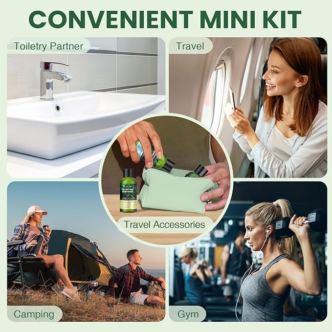 - 【Perfect Travel Size】 Recyclable bottles with easy-squeeze design reduces waste compared to single-use hotel toiletries. Each bottle in this set is designed in a convenient travel - size, perfect for your on-the-go lifestyle. 3.4 oz leak-proof bottles ideal for carry-ons, trips, gym bags, and hotels.