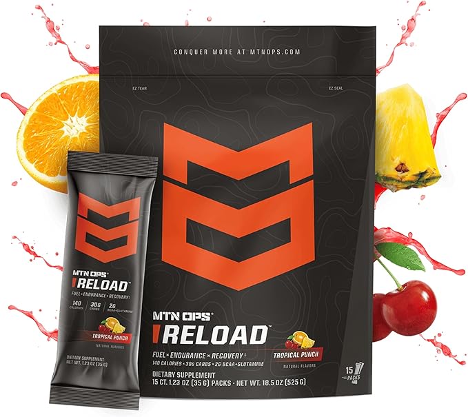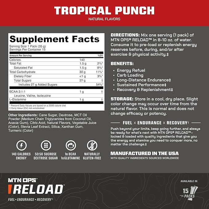 MTN OPS Reload Ready-to-Mix Carb Mix, 30g Fast-Digesting Carbohydrates, MCT Oil Powder & BCAAs, Energy & Endurance, Single-Serve Stick Packs, 15 Servings, Tropical Punch