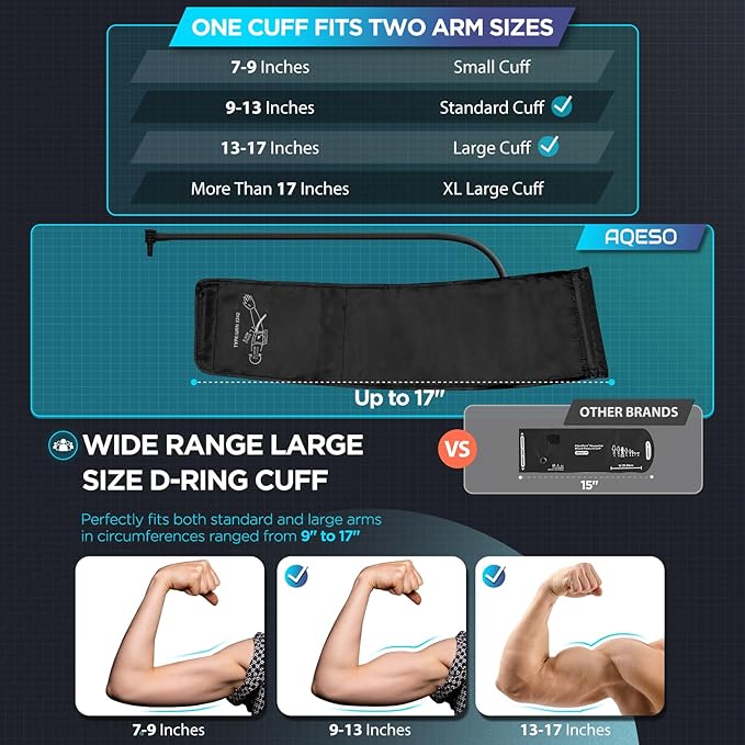 - BP Cuff Fits Most Arm Sizes - Accurate blood pressure readings require the correct size of the cuff. With AQESO wide-range cuff solution, this adjustable home blood pressure kit comes with medium/large cuff, which fits standard, and large arm sizes ranging from 9 to 17 inches. The cuffs feature hook-and-loop fasteners for ergonomic and comfortable at-home measurements, providing accurate and reliable readings for a wide range of individuals.