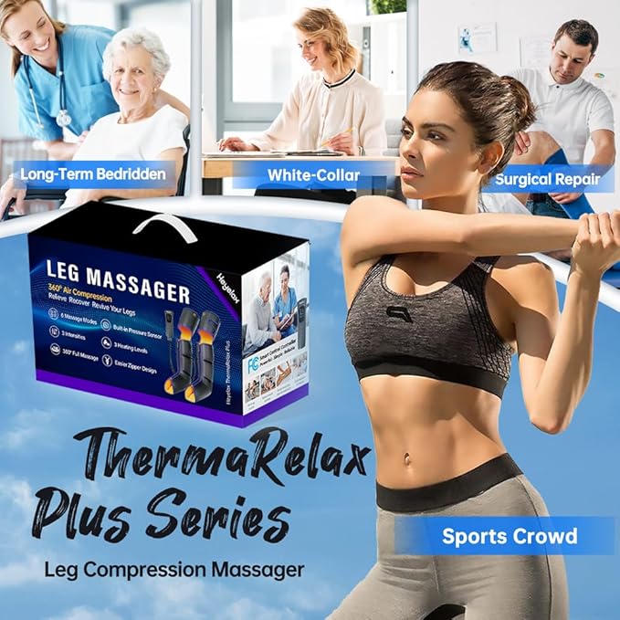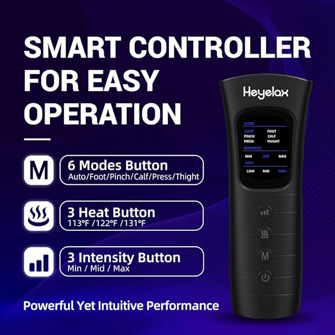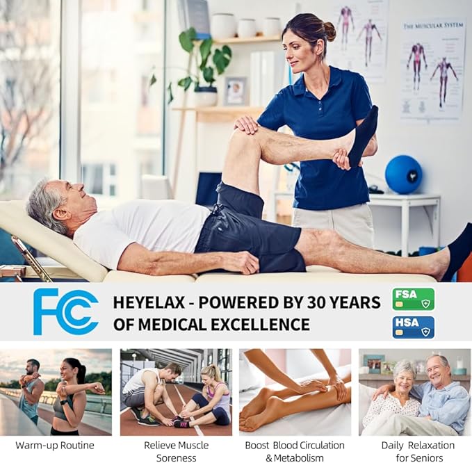 - [Medical-Grade Leg Compression Massager] Heyelax, backed by a prestigious listed hospital group, offers a medical-grade air compression leg massager for improved blood circulation and faster recovery. The air compression boots are designed to relieve leg pain and muscle cramps, providing therapeutic relief for restless legs, swelling, and poor circulation.