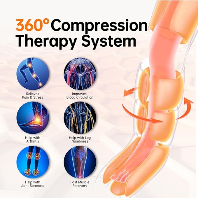 - 【From Thigh to Foot Massager ] 360° Compression Leg Recovery System combines the benefits of a foot massager, thigh massager, knee massager, and calf massager for circulation and pain. Featuring 4 targeted air chambers (thigh, upper calf, lower calf, foot), it delivers precise pressure that inflates and deflates sequentially for full leg coverage. Advanced smart sensors auto-adjust pressure for safety, while the memory function saves your preferred settings.