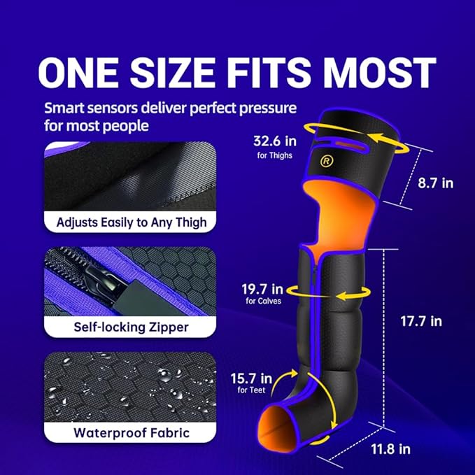 - 【Precise Fit & Fast-Inflate Pump】With an adjustable design, this leg massager fits snugly on thighs up to 32.6 inches, providing personalized comfort and enhanced blood circulation for every user The high-speed pump inflates much faster than standard models, delivering steady pressure for effective leg recovery