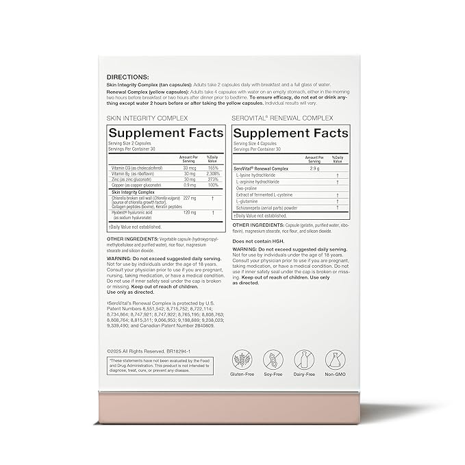 - L-lysine hydrochloride, L-arginine hydrochloride, extract of fermented L-cysteine, L-glutamine, oxo-proline, and schizonepeta: The highly precise blend that makes up the Renewal Complex supports enhanced pituitary function associated with vibrant energy, youthful skin, and increased lean muscle.*