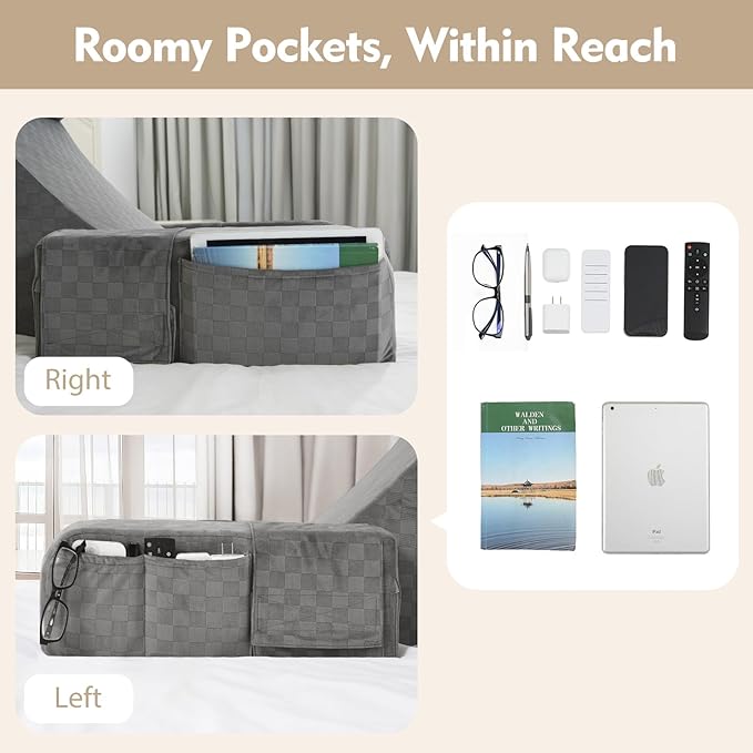- Extra-Large Side Pockets: Keep your essentials close—books, tablets, phones, glasses, remotes, snacks, and more—in the convenient side pockets