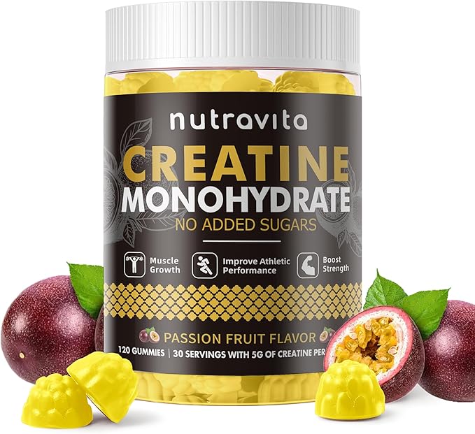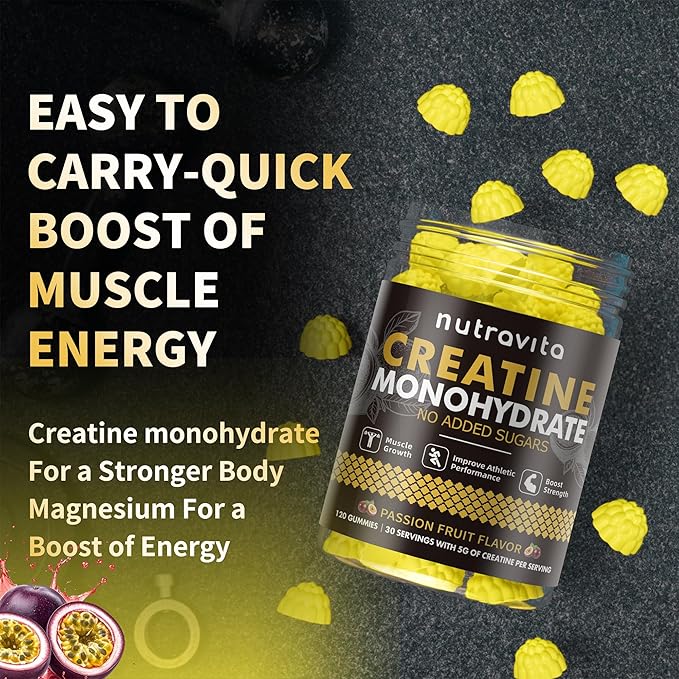 Nutravita Creatine Monohydrate Gummies for Men & Women-5g of Creatine Monohydrate per Serving - Sugar Free,Vegan, Passion Fruit Flavor, 120 Count
