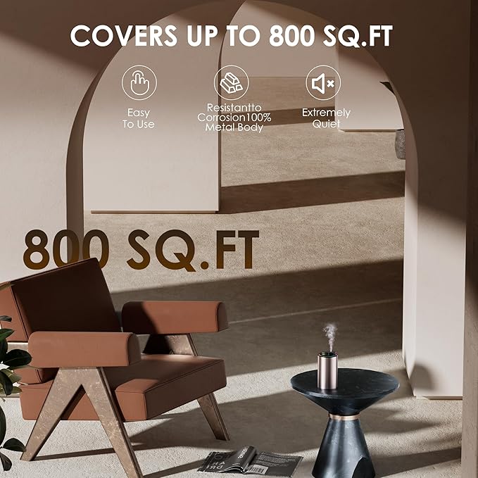 - Wide Coverage & Compact and Efficient: The Diffuser for Essential Oils can cover an area of up to 800 sq. ft and operates efficiently in large spaces. It effectively eliminates and masks unpleasant odors in areas such as pet rooms and bathrooms.