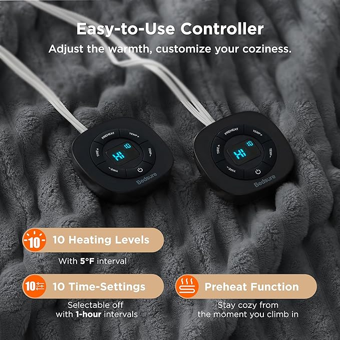 - Customizable Warmth: Featuring fast and consistent heating, this electric blanket offers 10 heating levels and 10 time-settings with preheat function for customizable coziness. Powered by advanced heating wire technology and equipped with dual controllers, it can precisely control temperature, ensuring safer warmth