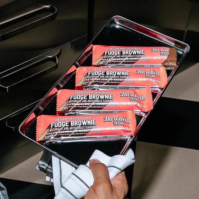 - BAREBELLS PLANT BASED FUDGE BROWNIE PROTEIN BAR – 12 decadent bars per box! Craving something chocolatey and plant-based? This rich, fudgy delight delivers brownie-level indulgence with 15g of protein from soy, peas, and rice. Certified Vegan, no added sugar, palm oil free—and dangerously delicious.