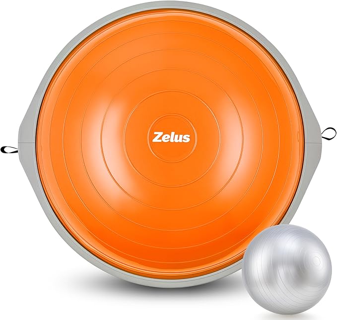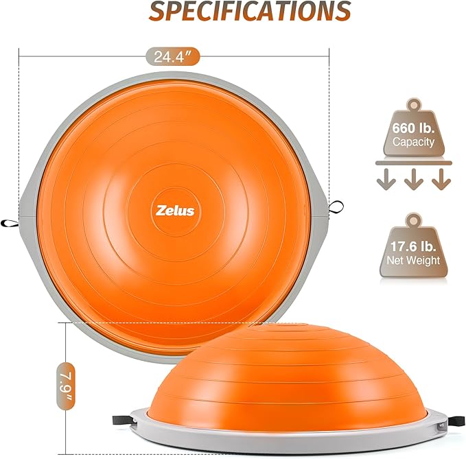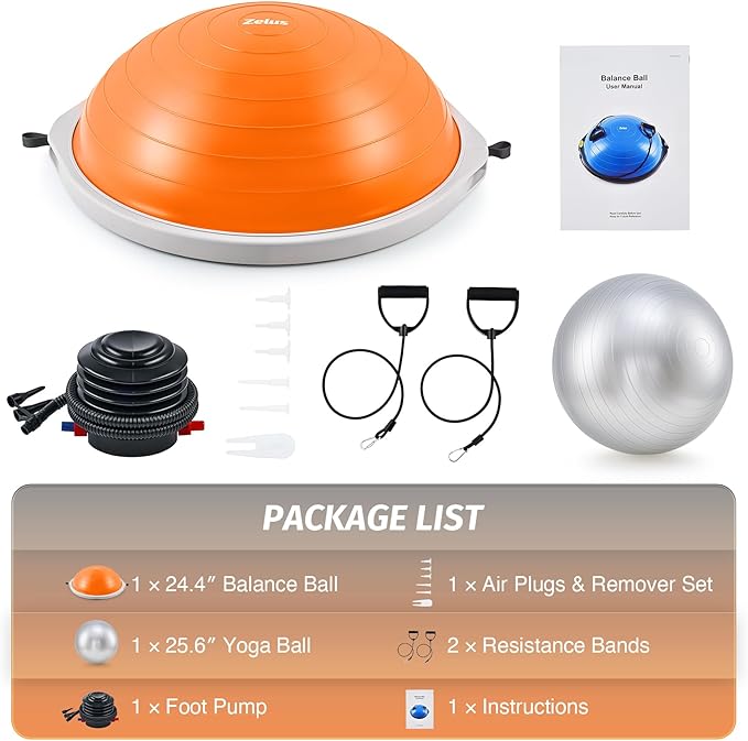 ZELUS 25in. Balance Ball | 660lb Inflatable Half Exercise Ball Wobble Board Balance Trainer w Nonslip Base | Half Yoga Ball Strength Training Equipment w 2 Bands, Pump, Extra Ball Included
