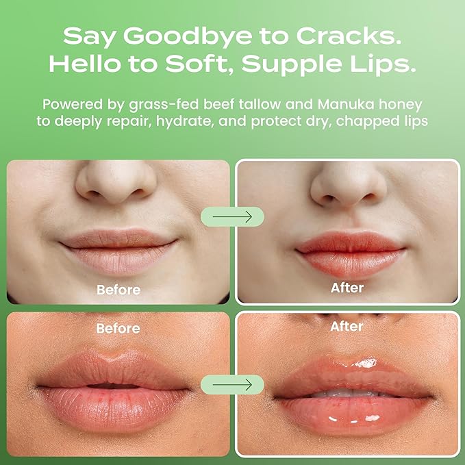 - Beef Tallow Moisturizer & Nourishment: Our beef tallow moisturizer locks in hydration and helps maintain soft, supple lips day and night.