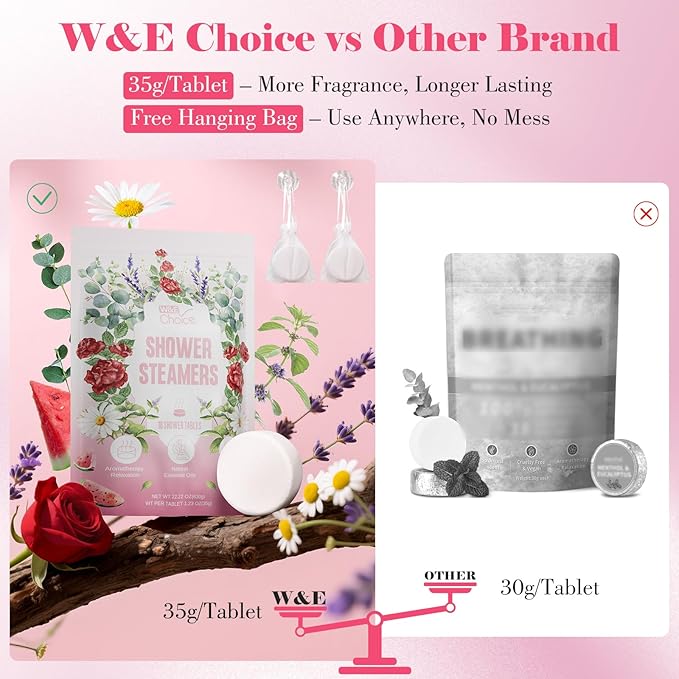 - Naturally Infused, Dye-Free Formula: Crafted with 100% pure essential oils and zero artificial dyes, W&E Choice shower steamers offer a clean, plant-based aromatherapy experience. They are great option for those seeking all-natural shower steamers aromatherapy.
