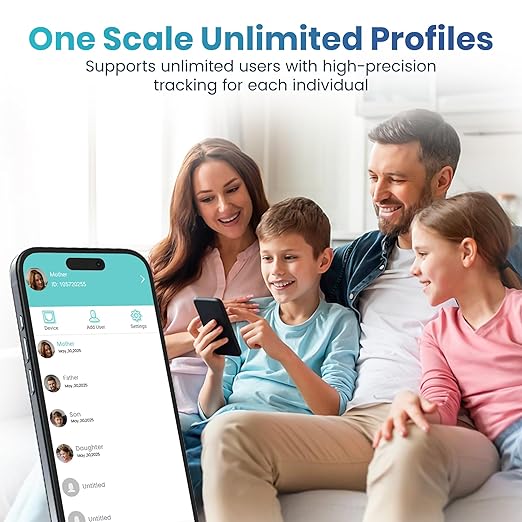 - [Multi-User Recognition] : This body composition scale Perfect for families and fitness groups. Create unlimited user profiles and let the scale automatically recognize each user for personalized data tracking.