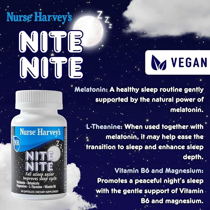 - ๐Sleep Routine For Adult: Nurse Harveyโs Nite Nite features a special formula enriched with melatonin and natural botanical extracts to help adults fall asleep more easily and support a healthy, restful sleep routine.