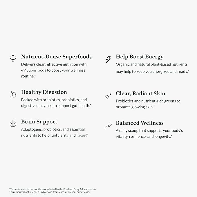 - A Nutrient Rich, Antioxidant Superfood. Greens First Original Greens Powder gives you the benefit of balanced whole nutrition with 49 superfoods, pre and probiotics, folate, and digestive enzymes, in a single daily scoop, to nourish your body and optimize your health.