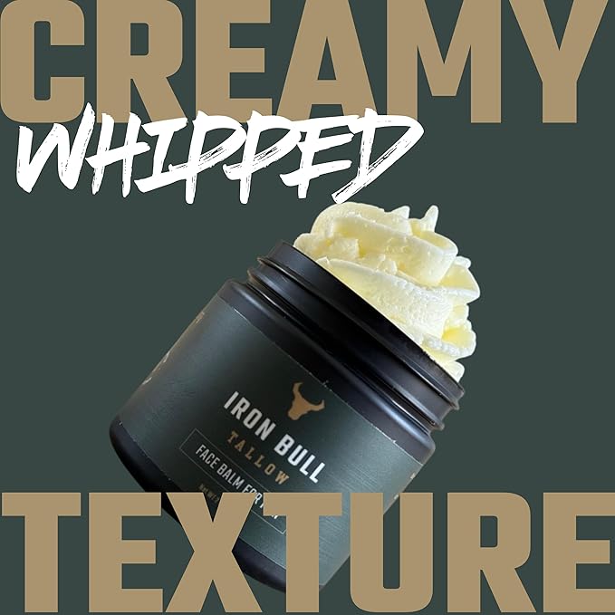 - WHIPPED BEEF TALLOW SKINCARE: Iron Bull beef tallow moisturizer face is loaded with vitamins A, D, E, and K , essential to maintain healthy skin, naturally. This small batch beef tallow balm for face deeply moisturizes and nourishes your skin, leaving it soft and brightened.