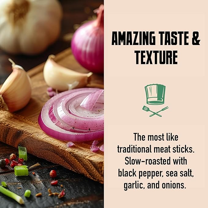 - Bold Savory Taste in a Portable Stick: Boldly seasoned with cracked black pepper, sea salt, garlic, and onion and then slow roasted for a deep umami flavor and a satisfying meaty texture.
