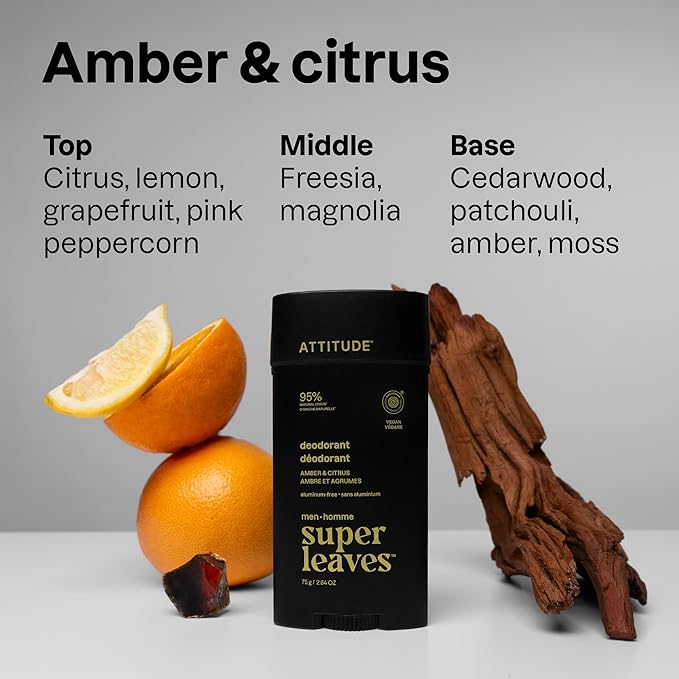 ATTITUDE Aluminum-Free Deodorant for Men, 95% Natural Origin Ingredients, EWG Verified, Plant Based Odor Control, With Baking Soda, Amber & Citrus, 2.64 Oz
