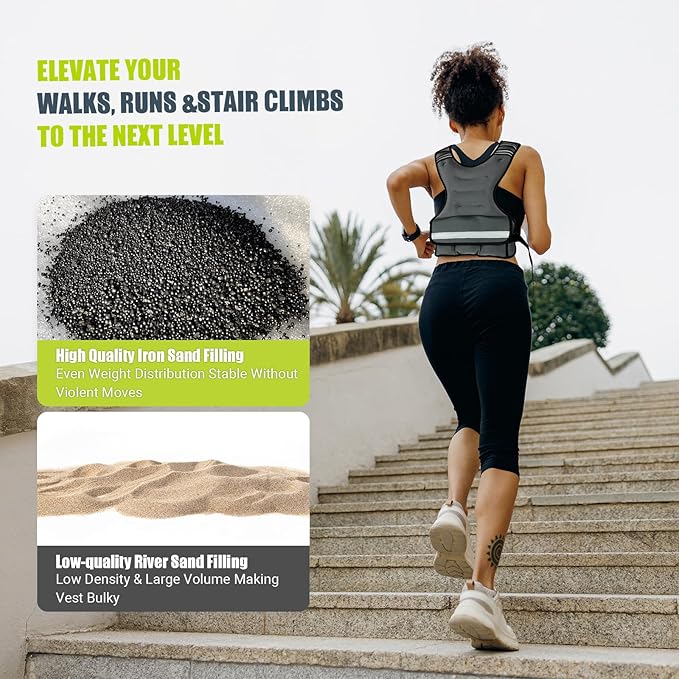 - [STABLE & NO BOUNCING DURING MOVEMENT] This adjustable weighted vest for women has a base weight of 6 lbs, equipped with 6 removable 1-lb weight packs. adjustable weighted vest is made from durable neoprene that resists tearing from wear and tear. The rucking vest for women offers excellent moisture-wicking and breathability, ensuring comfort during prolonged use. The soft ironsand filling provides even weight distribution, helping to maintain good posture while wearing weighted vest.