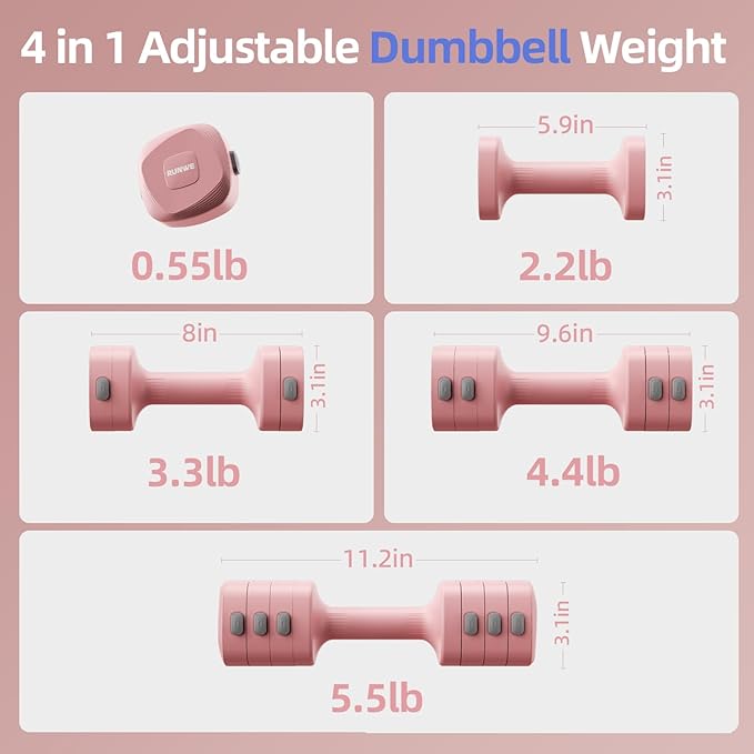 - 4 in 1 Adjustable Weight: Each dumbbell component adjusts between 2.2lb, 3.3lb, 4.4lb and 5.5lb (11lb total combined weight). The kettlebell converter weights 1.1lb(0.5kg), each dumbbell plate weights 0.55lb(0.25kg). Kettlebell weight adjustable from 5.5lb to 12.1lb, ideal for travel exercise, progressive training, and busy lifestyles. No tools needed!